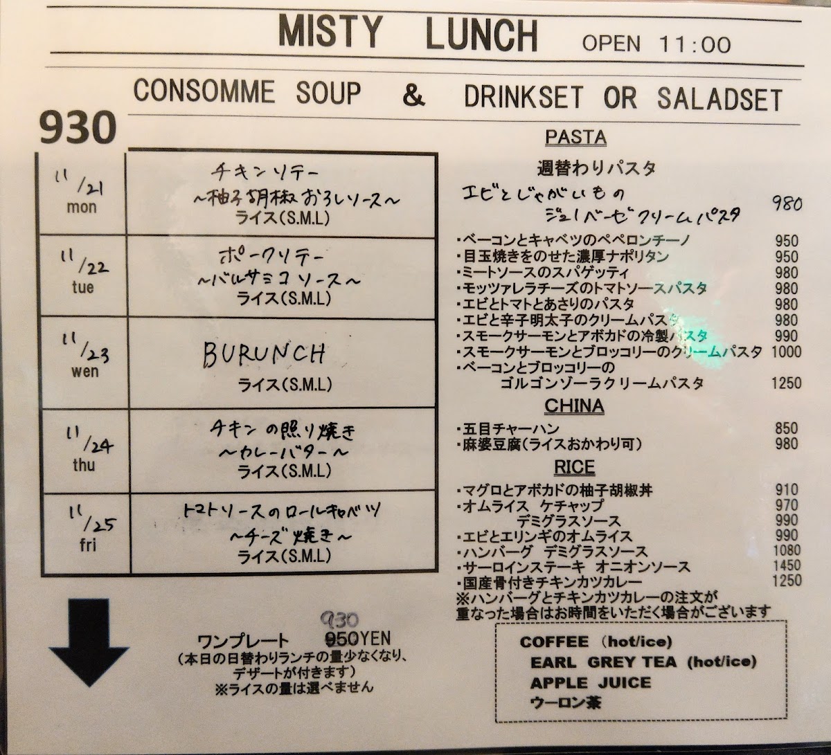 ※下記の内容は一例です。 (MON)国産豚バラ肉使用~ポークジンジャー~ (WED)チキンソテー~柚子こしょうおろしソース~ (THU)からあげ~特製ジンジャーだれ~ (FRI)ポルチーニクリームのオムライス + CONSO0MME SOUP & DRINKSET or SALADASET ☆ワンプレート890YEN(量少なめデザート付き)もあります。